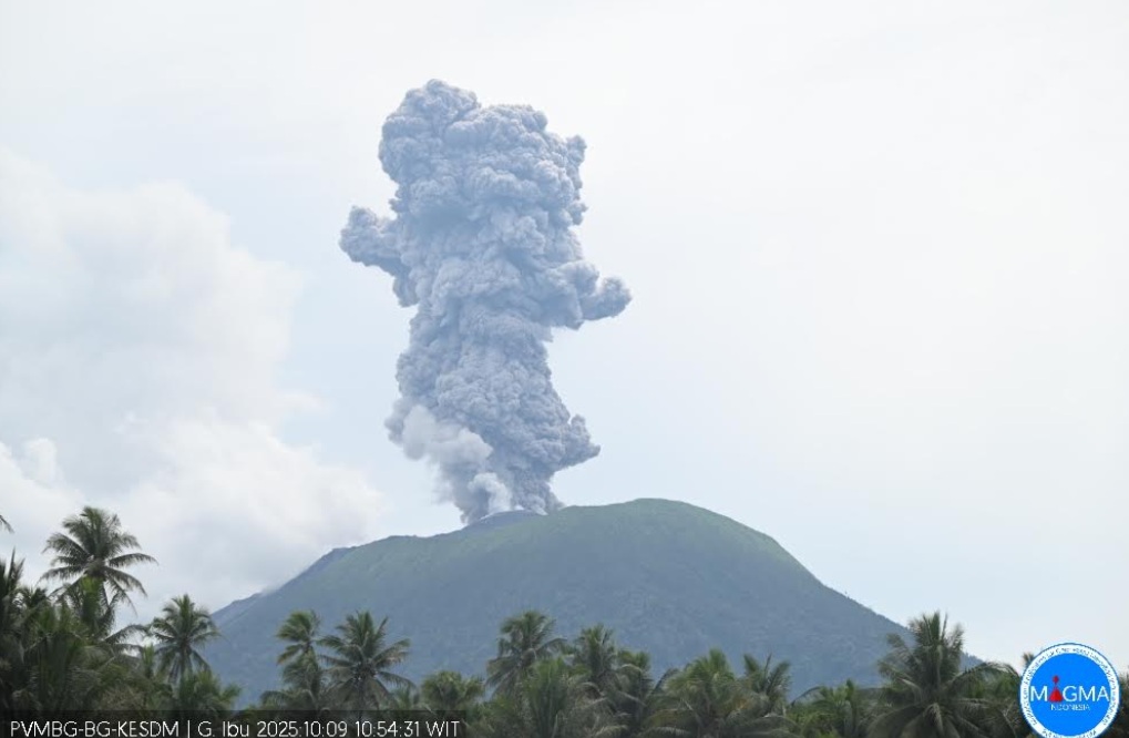 “Terjadi erupsi G. Ibu pada hari Kamis, 09 Oktober 2025, pukul 10:54 WIT dengan tinggi kolom abu teramati ± 2000 m di atas puncak (± 3325 m di atas permukaan laut),” ungkap Petugas Pos Gunung Api, M. Richard Chaniago dalam keterangannya.