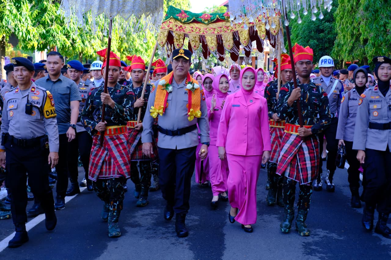 Irjen Djuhandhani bersama Ny. Upi Djuhandhani menyapa satu per satu jajaran personel Polda Sulsel yang berbaris menyambut kedatangannya.