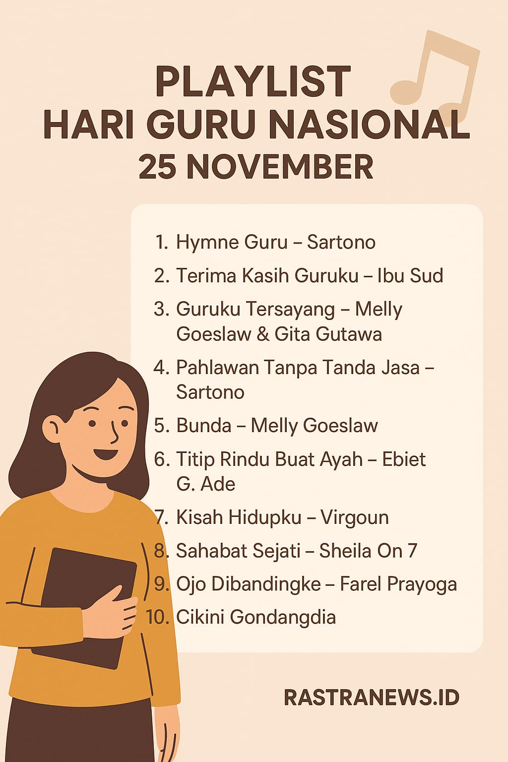 Untuk mendukung momen spesial ini, berikut rangkuman rekomendasi lagu pilihan Rastranews yang paling sering diputar dan selalu berhasil menghadirkan rasa haru pada peringatan Hari Guru.