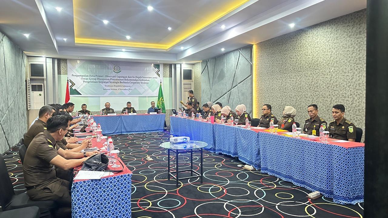 Rastranews.id, Makassar – Kejati Sulsel menjadi tuan rumah kegiatan Focus Group Discussion (FGD) dan In-Depth Interview dalam rangka Penyusunan Rekomendasi Kebijakan Pengelolaan Kegiatan Strategis Berbasis Corporate Strategy Kejaksaan RI.