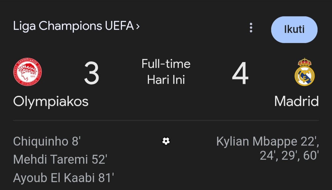 Rastranews.id, Makassar- Real Madrid berhasil membawa pulang tiga poin penting dari markas Olympiakos setelah menang dramatis 4–3 pada laga Liga Champions UEFA, Kamis (27/11/2025).