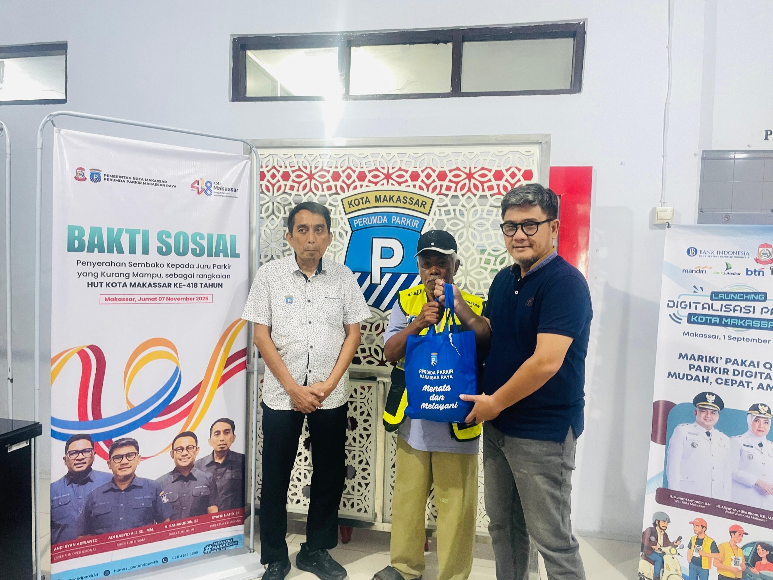 Selain program parkir gratis, Perumda Parkir Makassar Raya juga menggelar bakti sosial berupa pembagian paket sembako bagi ratusan jukir kurang mampu.