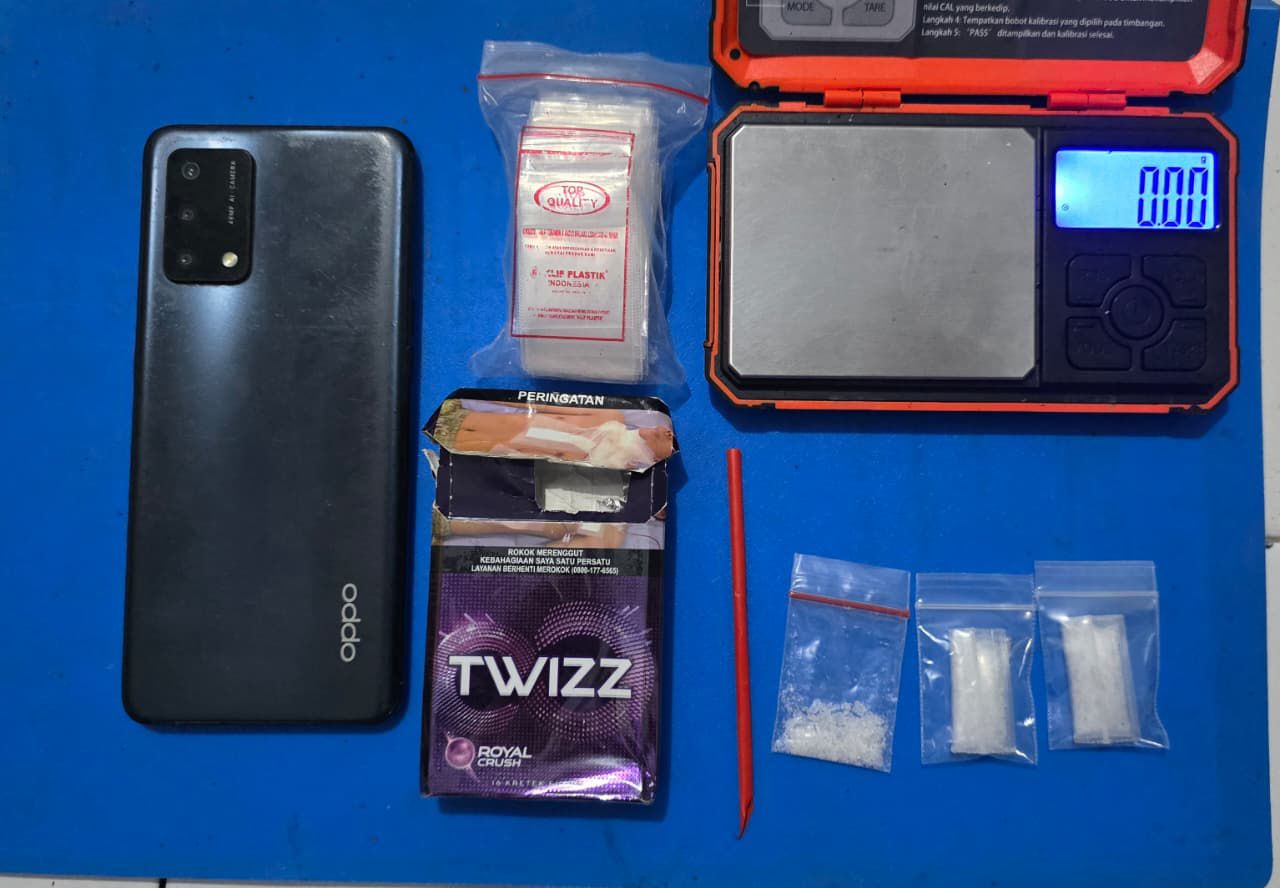 Dari penggeledahan tersebut, polisi menyita tiga saset plastik bening berisi sabu seberat total 3,46 gram, satu unit handphone Oppo warna hitam, timbangan digital, paket plastik bening kosong, pipet merah kecil, dan bungkus rokok bekas merek Twizz.