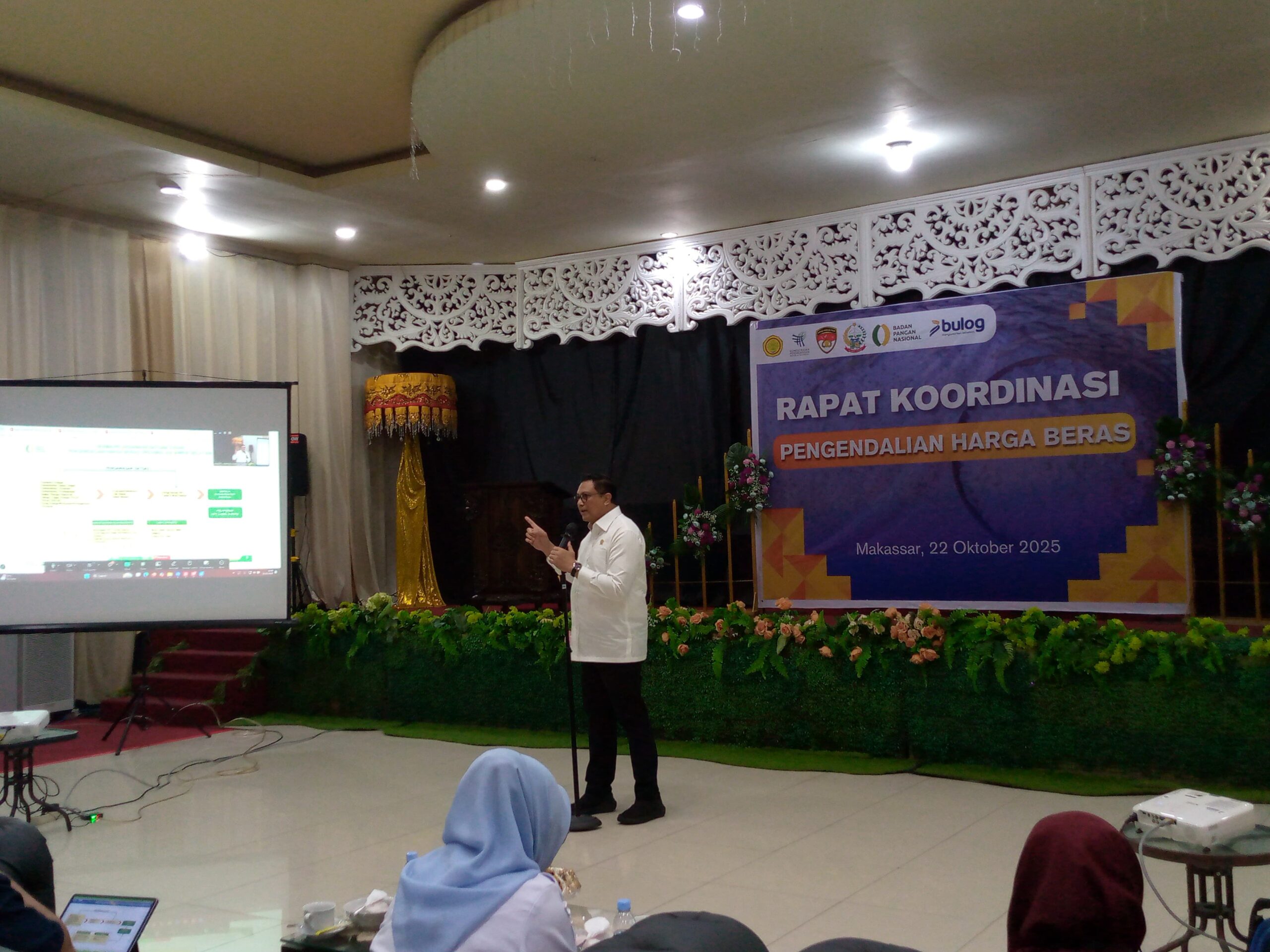 Hal itu disampaikan Direktur Pengawasan Penerapan Standar Mutu Pangan Bapanas, Brigjen Pol Hermawan, saat menghadiri Rakor Pengendalian Harga Beras di Kanwil Bulog Sulselbar, Rabu (22/10/2025) siang.