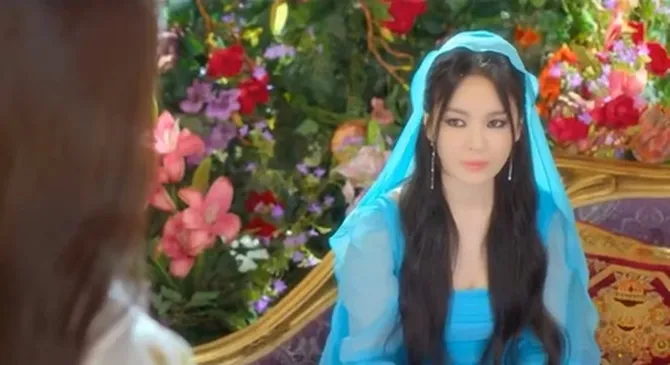 Karakter Song Hye Kyo langsung menyita perhatian saat muncul dengan gaun dan kerudung biru yang elegan, dipadukan dengan makeup bold di bagian mata yang menambah aura misteriusnya.