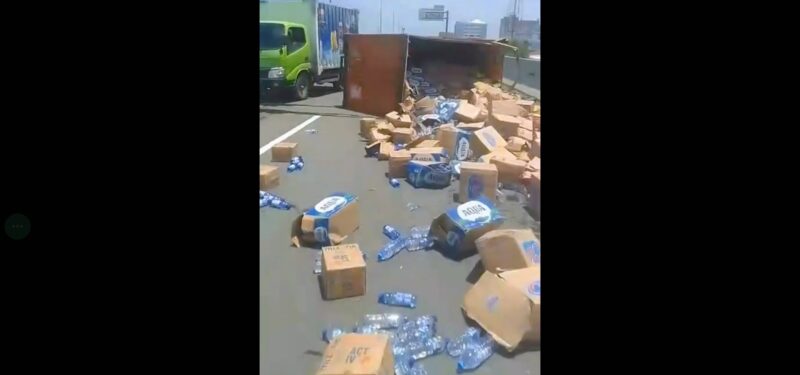 Video yang beredar di media sosial memperlihatkan kondisi truk dalam keadaan terbalik dengan muatan air mineral dalam kemasan botol berserakan di jalan tol. Dalam video berdurasi 32 detik itu, terdengar seorang pria mengonfirmasi penyebab insiden,