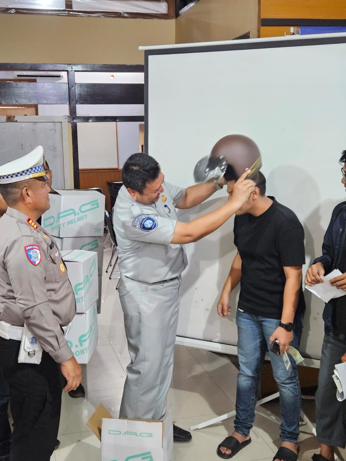Selain pembagian helm, kegiatan ini juga diisi dengan sosialisasi singkat mengenai aturan lalu lintas dan pentingnya melengkapi diri dengan perlengkapan keselamatan sebelum berkendara.